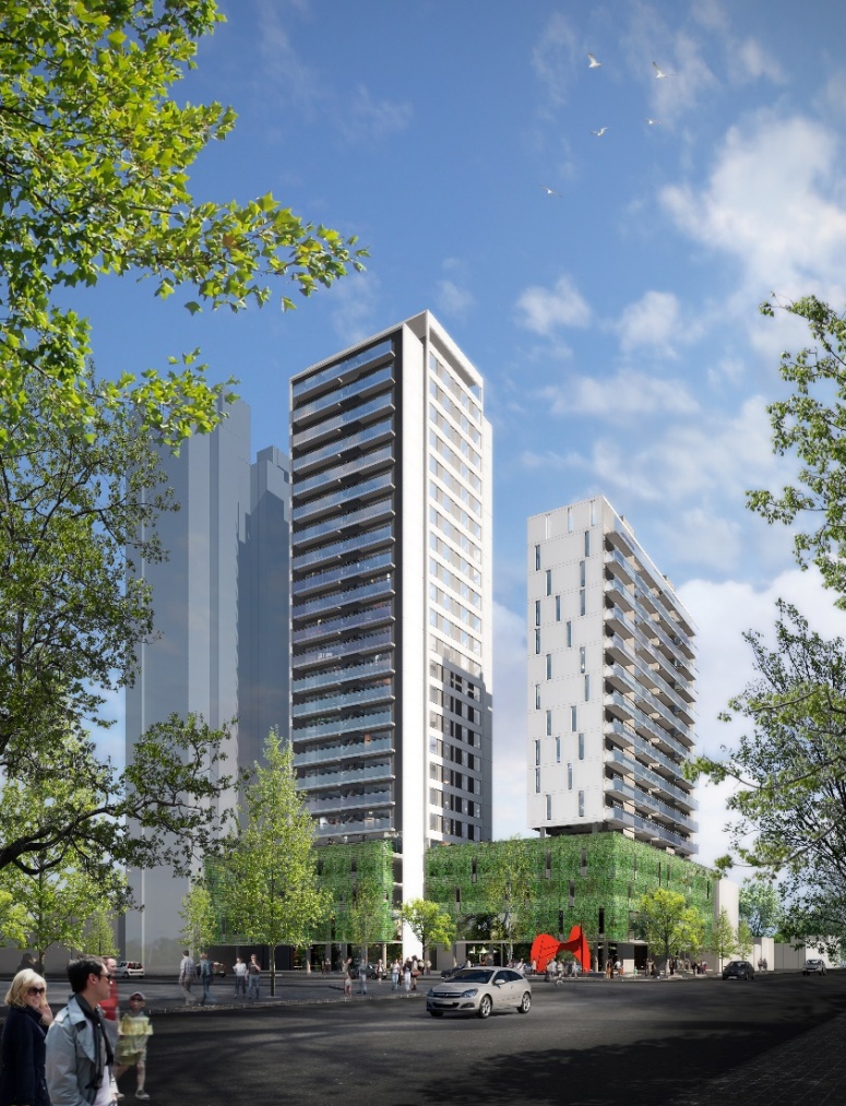 El edificio se compone por 2 torres de 10 y 19 pisos para 126 unidades funcionales, además de 3 niveles de basamento en común aptos para cocheras y servicios compartidos.